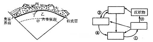 本题解析: 小题1:读左图,地球内部圈层中,甲是地核,乙是地幔,丙是地壳,丁是软流层。火山喷发的岩浆主要是来自软流层,D对。A。B、C错。 小题2:读右图,根据岩石的转化关系分析,沉积物形成的是沉积岩。沉积岩在变质作用条件下形成变质岩,变质岩与沉积岩可以相互转化,所以③是变质作用。在外力作用下岩石形成沉积物,②是外力作用。变质岩在高温下熔化形成岩浆,④是高温熔化,箭头指向的是岩浆。岩浆冷却凝固,形成岩浆岩,①是冷凝作用,箭头指向是岩浆岩。火山喷发形成的岛屿是岩浆冷凝形成,所以A对。B、C、D错。