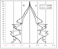 A.甲国人口出生率低 B.乙国劳动力资源丰富 C.甲国人口自然增长率高 D.乙国人口平均寿命短 2、单选题 图为“我国1970-2010年人口出生率和死亡率统计图。”读图回答问题。 3、单选题 读“1995年与2005年中国人口年龄结构示意图”,完成问题。 |