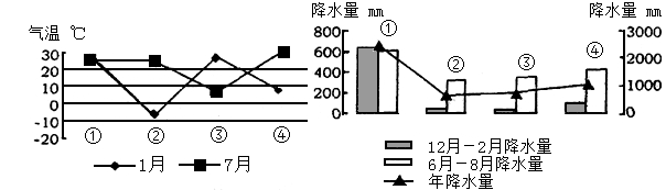 3、单选题 下图表示的是①、②、③、④四个地区的气温和降水等气候资料,据此回答问题。