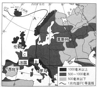 (1)影响A地等温线向高纬凸出的主要因素是?;从伦敦至莫斯科年降水量的变化特点是?。