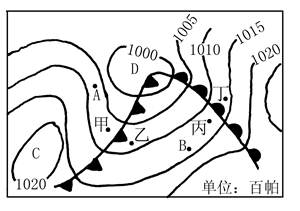 (4)图中在甲、乙、丙、丁四地中处于锋面雨区位置的有 ;冷锋过境后与暖锋过境后的共同天气现象是 。