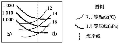 【小题2】沿海地区是平原,地形平坦,性质比较单一,附近地区是海洋,海陆热力性质差异显著;夏季陆地升温快,气温高,而同纬度海洋升温慢,气温相对较低,所以7月陆地等温线向南凸;1月份陆地降温快,气温低,气压高,而同纬度海洋降温慢,气温相对较高,气压相对较低,所以1月陆地等压线向北凸;故选项B正确。