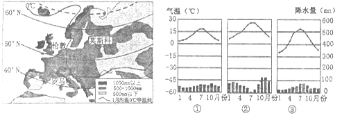 【小题1】从①②③三地气温曲线和降水量柱状图,可以判断出①为温带海洋性气候,对应的是伦敦;②为地中海气候,对应的是罗马;③为温带大陆性气候,对应的是莫斯科。故答案为C。