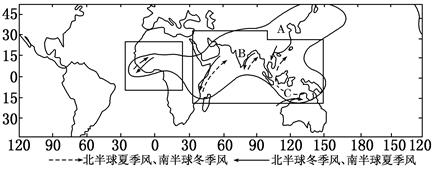 3、单选题 读世界季风明显地区地理分布图,图中箭头显示了一些地区地面季风风向。据此完成下列小题。
