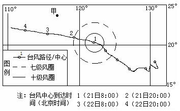 小题1:甲地风力初始达到7级时,北京时间为 A.9月22日2:00 B.9月21日20:00 C.9月22日8:00 D.9月22日14:00