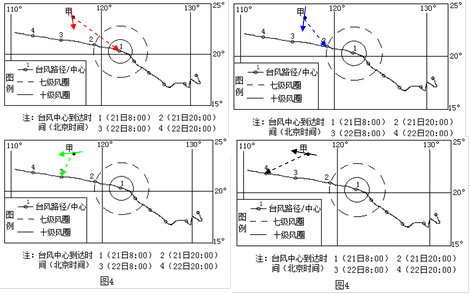 小题1:从图中可以看出甲地风力初始达到7级时间段为2-3之间(即北京时间21日20:00-22日8:00之间),A对。