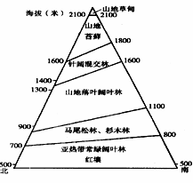 本题解析:本题考查山地垂直自然带的分布。根据该山地的山麓自然带为亚热带常绿阔叶林判断,该山地分布于亚热带地区,南坡自然带向上倾斜,判断南坡为向阳坡,热量条件较北坡优越。