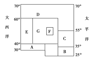 (1)A位于30°-40°之间的大陆西岸应为亚热带常绿硬叶林带;C位于35°-55°之间的大陆东岸应为温带落叶阔叶林带;D位于辐极地地区的大陆北部应为亚寒带针叶林带;F位于中纬度大陆内部应为温带荒漠带。