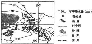 (2)图示区域降水总体空间分布特点是?,成因是?。图中A区域降水量??(大于或小于)400mm,其形成原因是?(8分)