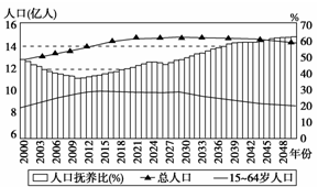 5、单选题 根据《2007年国家人口发展战略研究报告》,我国自20世纪80年代以来生育率下降导致人口抚养比下降1/3,为经济增长创造了40年左右的“人口红利”期。读我国人口抚养比变化示意图,回答下列各题。