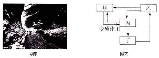 【小题2】根据图文资料,该地岩石层理明显,有粗砂砾石,应是沉积岩。根据图乙中的箭头方向判断,丙是变质岩,甲丙可以相互转化,甲是沉积岩。丁可以形成乙,所以丁是岩浆,乙是岩浆岩。所以A对。
