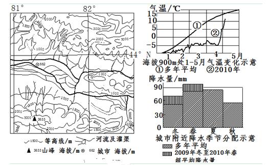 5、综合题 阅读图文资料,完成下列各题。下面的三幅图分别示意某地区的地形、1~5月气温变化和降水季节分配。(1)根据图中信息,从地形、气候两方面分析图中城市所在河谷地区发展种植业的条件。(6分)(2)指出2009~2010年冬春季节该地区降水和气温的突出变化,并说明其对农业生产的影响。(10分)