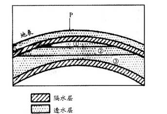 1.图中的地质构造名称是2.从P点向下钻井,当钻头位于①、②、③“层”时,可能分别探测到