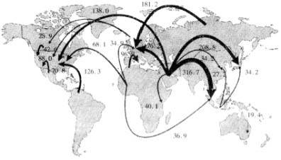 2、单选题 下图是2001年世界石油贸易流向、流量示意图(单位:百万吨)。读图完成问题。