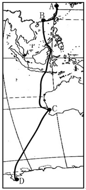 1.在整个航行过程中,下列说法正确的是:2.当该考察船到达C港口时,该地的气候特点是:3.在图中的A、B、C、D四点中,地球自转线速度最快的是: