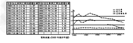 3、综合题 下面是我国1980年至2002年人口出生率、死亡率和自然增长率统计图表,读图后完成下列内容: