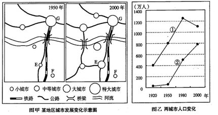 A.城市化程度愈高,都市可能出现热岛的效应愈显著 B.城市化程度愈高,下水道普及率也一定愈高 C.下水道普及率高的城市,其径流量愈低 D.城市化程度与下水道普及率均直接影响到全球变暖的速度 3、单选题 扬州在京杭运河淤塞后,逐渐失去了往日的繁华,京沪铁路修好以后,扬州又重新得到发展,这说明 4、综合题 阅读下述材料,回答下列问题(7分)。 (1)根据材料一,结合所学知识比较发达国家和发展中国家城市化的主要不同点。(4分) (2)结合材料二,指出经济增长与城市化的一般关系。(2分) (3)材料二中①至⑤点能表示中国城市化水平与经济发展关系的点是________。(1分) 5、综合题 城市是社会经济发展最活跃的地区,读图回答问题。(10分) |