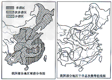 4、综合题 读《我国部分地区雨涝分布图》和《我国部分地区干旱总次数等值线图》,结合所学知识回答