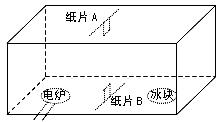 4、单选题 图是一个长、宽、高分别是2米、1米和1米且六面都封闭的透明玻璃柜,柜内底面两侧分别放置一个电炉(有导线连到柜外)和一大盆冰块。在玻璃柜顶部和下部悬垂纸片A、B(如图所示)。电炉通电一段时间之后,根据纸片A、B的偏动情况,可以模拟验证某一地理原理。据此完成问题。