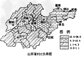 5、单选题 阅读山东省外商直接投资(简称FDI )分异图(图例中数字为外资投资比例,截止2010 年),?完成1-2题。