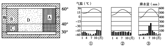 (3)右图为三种气候类型的气温曲线和降水量柱状图,将其序号与上图四地气候类型的代表字母对应填空:①________,②________,③________。(3分)
