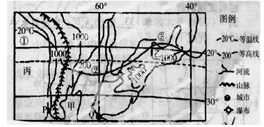 (1)读图,根据经纬度和海陆轮廓判断,图示区域是南美洲,结合南美洲地形和世界洋流分布状况,①处有秘鲁寒流经过,受寒流的影响,与同纬度地区相比,气温较低,等温线向低纬弯曲。②处位于南美洲中部平原地区,属于拉普拉塔河平原,地势低,所以气温较高。等温线向较高纬度弯曲。③处位于巴西高原上,根据等高线数值可知,这里地势较高,气温比较低。所以等温线向低纬弯曲。
