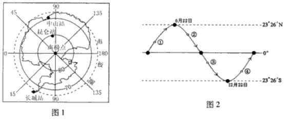 2、单选题 图1为“我国三个南极科学考察站分布示意图”,其中昆仑站于2009年1月27日建成,这是我国在南极内陆建立的第一个科学考察站。图2为“太阳直射点回归运动示意图”。读图完成1~3题。