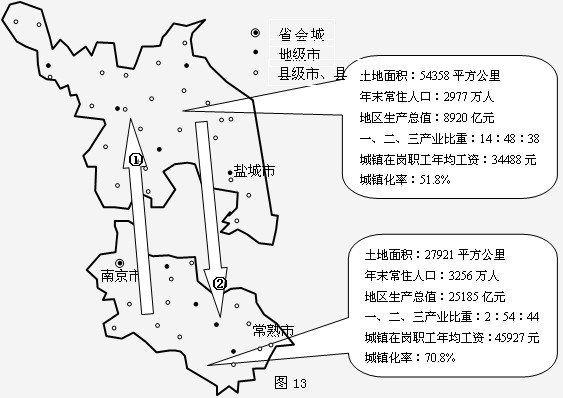 1、单选题 实现区域共同发展,是江苏人的梦想。读“2010年苏南、苏北部分统计数据以及区际联系示意图(据江苏省统计局)”,完成以下问题。