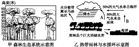 【小题1】读图,图甲的森林生态系统不同高度层次有不同的植被,森林茂密,应是热带雨林。欧洲纬度高,缺少热带雨林分布,A错。北美洲热带地区陆地狭小,C错。大洋洲雨林气候区面积小,B错。亚洲热带雨林区面积较大,是主要分布区,D对。
