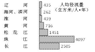 (2)根据材料二我国主要河流人均径流量,可看出辽河、海河、滦河、淮河、黄河、松花江等北方河流的人均径流量都较小,而长江、珠江等南方河流的人均径流量都较大,由此可判断我国人均径流量分布的空间差异是南方多、北方少;径流量主要是受降水影响,结合我国降水分布,可知我国年降水量南方多北方少;解决我国水资源的空间分布不均主要采取跨流域调水(南水北调工程);跨流域调水主要是通过河流、运河、渠道来实现,主要是通过改变水循环的地表径流来实现。