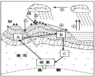 ⑴ 图中A、B、C和岩浆构成了岩石圈的物质循环,其中A表示 岩。