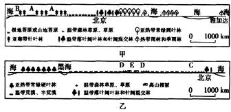 2、单选题 下列两幅图中,甲图为从雅加达到北京附近沿经线的植被分布示意图,乙图为经北京附近沿纬线的植被分布示意图。读图回答: