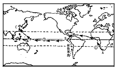 第(1)题,本题考查水循环的类型,根据水循环的发生领域可以判断:A为陆地内循环,B为海陆间循环,C为海上内循环。