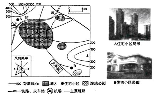 小题2:A小区邻近内城,为低级住宅区,B小区位于城市外缘,邻近湿地公园和大学城,环境优美,交通便捷,为高级住宅区,故A小区房价低于B小区。