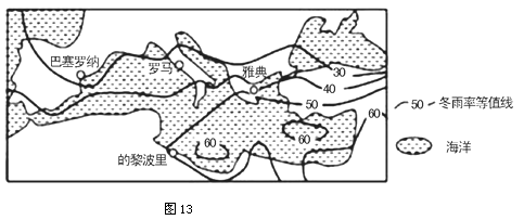4、综合题 (10分) 图13为地中海地区冬雨率等值线图(冬雨率为冬季降水量占全年降水量的百分率,单位:%)。读图回答下列问题。(10分)?