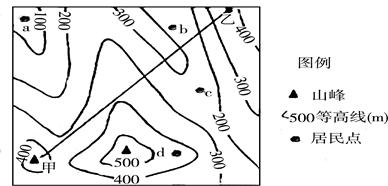 小题2:为了保护生态环境,当地政府计划将图中a、b、c、d四处居民点集中到一处。地理小组建议居民点集中建在水源最丰富的地方,该地应选在( )