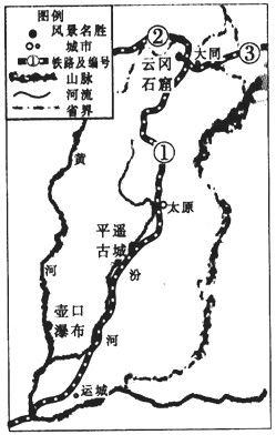 (3)大同是我国传统的煤炭工业区。煤炭外运至秦皇岛的铁路干线是线____(限填图中的一个铁路编号)该地大量使用煤炭产生的SO2形成酸性物质可能会对石窟造成损害,试从减少SO2排放以保护石窟的角度提出该工业区的综合整治措施。