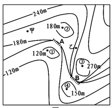小题1:从图中可见等高距为30米,根据等高线规律,①四周是120米是小的,说明①的数据范围是90-120米,比四周低,可能是湖泊;②周围是180米,也是小的,②的数据范围是150-180米,比四周低,可能是湖泊;③和④周围数据在两侧数值中是大的,③的范围是270-300米,比周围高,不可能成为湖泊;④的范围是150-180米,比周围高,不可能成为湖泊。①②同在山谷中,②的下游有陡崖,可能形成瀑布,B对。