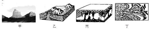 (1)若图中M、N、P、Q构成水循环,则Q表示?;若图中M、N、P、Q构成某日热力循环,则Q表示?风。 (2)图中①--④四个岩层由老到新的排列是?。 (3)图中⑤--⑧代表岩石圈物质循环过程,⑦表示??作用;⑧表示?作用。 (4)填出图中字母代表的岩石名称。A和B是?岩、D是?岩。 (5)从褶皱的弯曲形态判断,图中乙地是??;从地表的形态判断,图中甲地的 地貌是?,其形成的原因是? ?。 (6)丁地岩体相对两侧岩体的位移方向是??(上升或下降)。