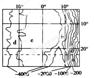 小题1:本小题可直接根据图示的等深线分布判断。a位于沿海,水深-200米以内,故判断为大陆架;b位于大陆架边缘,等深线较密集,故判断为大陆坡;c处等深线分布稀疏,表示大洋中心地势较平坦的洋盆;d处海拔比c处要高得多,属于海岭,即大西洋中脊。