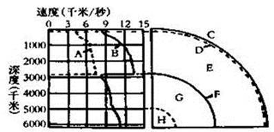 (2)图中F处,地震波A完全 ,地震波B波速度 并继续往深处传播。这说明F面以上的E物质状态为 ,以下的G物质状态可能为 态。
