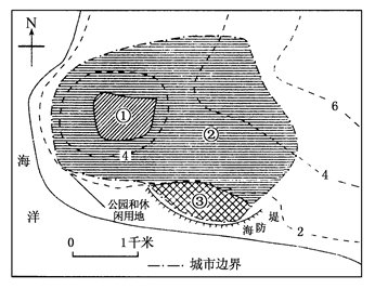 本题解析:①位于市中心,为商业区;②面积最大,为住宅区;③位于与盛行风相垂直的郊外,为工业区。