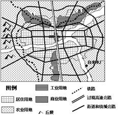 5、综合题 (11分)该图为某市用地略图,其中城市北面多为盐碱地,东面和南面以高产田为主。读图回答以下问题。