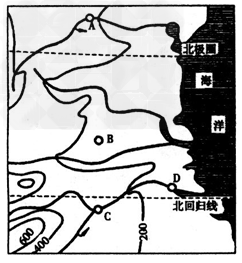 5、综合题  下图中有A、B、C、D四座城市,试从地形、气候和河流等区位因素分析并回答问题。