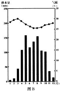 3、单选题 图A为世界1月平均气温10~22℃范围示意图,图B为某地年内各月气温变化曲线与降水量柱状图。读图回答1—2题。