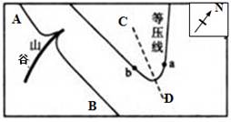 【小题2】CD为暖锋,降水在冷锋后暖锋前,可知降水主要在b地区,a地为低纬受暖气团控制天气晴朗,该气旋系统为顺时针辐合上升,CD锋面将向南移动,b地此时吹东北风,故选A.