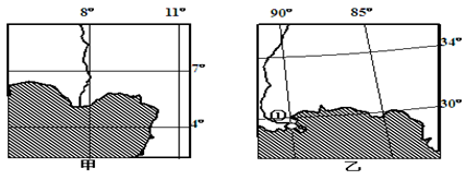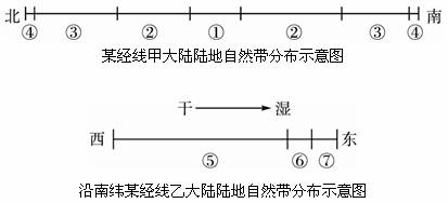 小题2:结合上题结论,甲大陆为非洲大陆,那么自然带①为热带雨林带、②为热带草原带、③为热带荒漠带、④为亚热带常绿硬叶林带。乙大陆位于南半球,但由西向东降水由少到多且干旱面积较大,可判断为澳大利亚大陆。从图中可以看出⑤为热带荒漠带,与甲大陆③自然带相同。