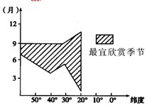 本题解析:杭州的天目山大致位于30°N左右,由图可知,小明应该选择在5-9月出游。