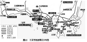 材料二?三亚市拥有海南岛最美丽的海滨风光,被称为“东方夏威夷”。在约两百公里的海岸线上密布亚龙湾(又称“天下第一湾”)、大东海、鹿回头公园、天涯海角、海山奇观、南山文化旅游区等闻名中外的旅游景点。下面为三亚市旅游景区分布图。