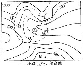 4、单选题 下图是“某地地形简图”,M点位于36.5。N。两中学生分别到达P、M点,测量并计算出两点相对高度是288米,读图回答1~3题。